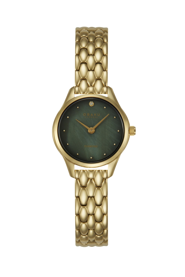 Zarafeti ve şıklığı bir arada sunan Obaku Smykke Petite Cider, altın kaplama paslanmaz çelik kasa ve bileziğiyle dikkat çekiyor. Işıltılı yeşil sedef kadranı çevreleyen bu tasarım, saat 12 konumunda yer alan sertifikalı SI1 tek kesim pırlanta ile sofistike bir lüks dokunuşuna sahip.11 zarif saat imi ve 24 mm’lik klasik ölçüsüyle, sıcak altın tonlarının zamansız şıklığını bileğinizde taşıyın.